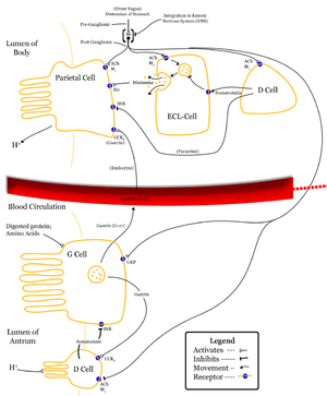 يفرز هرمون الكولي سيستوكنين من الطبقة المخاطية للجزء العلوي من الأمعاء الدقيقة نتيجة لوجود نواتج الهضم الجزئي للبروتينات والمواد الدهنية. وينتقل هذا الهرمون عن طريق الدم إلى المرارة حيث يسبب تقلصها. مما يؤدي إلى طرح العصارة الصفراء إلى الأمعاء الدقيقة لكي تقوم بدورها المهم في استحلاب الدهون لغرض هضمها تحت تأثير الأنزيمات. كما أنه يثبط حركة المعدة وعليه فإن هذا الهرمون في الوقت الذي يسبب فيه تقلص المرارة وإفراغها فإنه يقلل من إفراغ المعدة للغذاء. وذلك لإتاحة الفرصة لعملية هضم الدهون في الجزء العلوي من المعدة. ونتقل الكولي سيستوكنين عن طريق الدم أيضا إلى البنكرياس ، حث يحفزه كميات كبيرة من الأنزيمات الهمضية ، كما يعزز الكولي سيستوكنين من تأثير هرمون السكريتين ، في إفراز البيكربونات من البنكرياس. ويبدو أيضا أن الكولي سيستوكنين هو المنظم الفيسيولوجي لنمو الجزء الخارجي من البنكرياس.