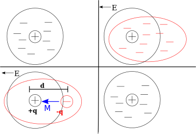 In the classical approach to the dielectric model, a material is made up of atoms. Each atom consists of a cloud of negative charge (Electrons) bound to and surrounding a positive point charge at its center. In the presence of an electric field the charge cloud is distorted, as shown in the top right of the figure.