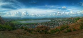 Madurai is located at 9°56′N 78°07′E / 9.93°N 78.12°E.[53] It has an average elevation of 101 metres. The city of Madurai lies on the flat and fertile plain of the river Vaigai, which runs in the northwest–southeast direction through the city, dividing it into two almost equal halves.[54] The Sirumalai and Nagamalai hills lie to the north and west of Madurai.[55] The land in and around Madurai is utilised largely for agricultural activity, which is fostered by the Periyar Dam.[55] Madurai lies southeast of the western ghats, and the surrounding region occupies the plains of South India and contains several mountain spurs.[56] The soil type in central Madurai is predominantly clay loam, while red loam and black cotton types are widely prevalent in the outer fringes of the city.[57] Paddy is the major crop, followed by pulses, millet, oil seed, cotton and sugarcane.[57]