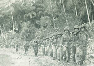 The Empire of Japan invaded Maluku early in 1942 as part of its Dutch East Indies Campaign of World War II, ousting the Dutch from the region. Halmahera became the site of a Japanese naval base at Kao Bay. 2 years later, US forces and their allies launched the Battle of Morotai in 1944; bombing the island in August and invading it in September. Imperial Japanese forces on Morotai held out until 1945 but failed to expel the Allies. In the latter part of 1944, 61,000 personnel landed on Morotai.[34] Two thirds of them were engineers, who rapidly established facilities including harbors and two airstrips[34] plus extensive fuel stores. The formal surrender of the Second Japanese Army took place at Morotai on 9 September 1945. The last Japanese holdout from the war, Private Teruo Nakamura (Amis: Attun Palalin), was discovered by the Indonesian Air Force on Morotai, and surrendered to a search patrol on December 18, 1974.[35]