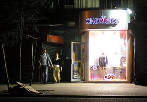 A couple leaves a sex shop on St. Mark's Place late night in New York City.