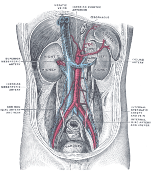 Any obstruction of the venous vasculature of the liver is referred to as Budd–Chiari syndrome,[19] from the venules to the right atrium. This leads to increased portal vein and hepatic sinusoid pressures as the blood flow stagnates. The increased portal pressure causes increased filtration of vascular fluid with the formation of ascites in the abdomen and collateral venous flow through alternative veins leading to esophageal, gastric and rectal varices. Obstruction also causes centrilobular necrosis and peripheral lobule fatty change due to ischemia. If this condition persists chronically what is known as nutmeg liver will develop. Kidney failure may occur, perhaps due to the body sensing an "underfill" state and subsequent activation of the renin-angiotensin pathways and excess sodium retention.[15]