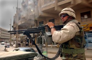 جندي من البحرية الأمريكية يقف على مدفع رشاش مثبت على مركبة، أثناء دورية في مدينة الحلة بالعراق في مايو 2003.