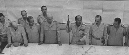 غرفة عمليات حرب أكتوبر: من اليمين: حسني مبارك، الجمسي، السادات، احمد اسماعيل، محمد علي فهمي، محمد سعيد الماحي...
