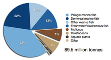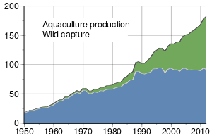 According to the Food and Agriculture Organization (FAO), the world harvest by commercial fisheries in 2010 consisted of 88.6 million tonnes of aquatic animals captured in wild fisheries, plus another 0.9 million tons of aquatic plants (seaweed etc.). This can be contrasted with 59.9 million tonnes produced in fish farms, plus another 19.0 million tons of aquatic plants harvested in aquaculture.[1]