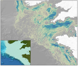 Map of underwater topography. (1995, NOAA) The productivity of marine fisheries is largely determined by marine topography, including its interaction with ocean currents and the diminishment of sunlight with depth. Fishing activities extracted from Automatic Identification Data of EU trawlers over the continental shelf,[2] highlighting the correlation with the bathymetry over the area (bottom-left, from the GEBCO world map 2014). Marine topography is defined by various coastal and oceanic landforms, ranging from coastal estuaries and shorelines; to continental shelves and coral reefs; to underwater and deep sea features such as ocean rises and seamounts. |