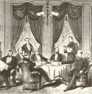 مباحثات السلام في الفندق على شوان. حفر على الخشب من زمن المفاوضات