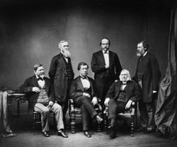 المندوبون السامون البريطانيون إلى معاهدة واشنطن 1871. وقوف: ش. إلى ي.: Lord Tenterden, Sir John A. Macdonald, Montague Bernard. جلوس: ش. إلى ي.: Sir Stafford Northcote, Earl de Grey & Ripon, Sir Edward Thornton