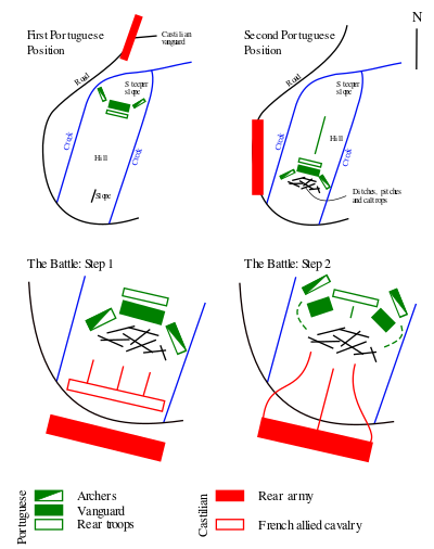 Around six o'clock in the afternoon the Castilian army was finally ready for battle. According to John of Castile's report of the battle, his soldiers were by then very tired from the march that had started early in the morning under a blazing August sun. There was no time to halt then, and the battle would soon begin.[بحاجة لمصدر]