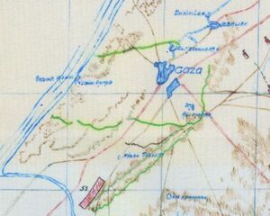 On 28 February, Chetwode's Desert Column occupied Khan Yunis unopposed and the headquarters of the Column was established at Sheikh Zowaiid, while Eastern Force headquarters remained at El Arish.[3] The ancient town of Khan Yunis on the main road to Gaza was said to be the birthplace of Delilah. With bazaars, narrow streets and a castle, it was one of several villages in this fertile area of southern Palestine, 6 ميل (9.7 km) north of Rafa and the Egyptian–Ottoman frontier. Here was found the largest and deepest well in the area, and after engineers had installed a pumping machine, it gave an unlimited supply of water for both men and horses. The village quickly became an important forward site for supply depots and bivouacs.[6][24] Around Khan Yunis gardens, orange orchards, fig plantations and grazing were carried on by the local population, while in the Rafa and Sheikh Zowaiid areas barley and wheat were grown.[6][7][8]