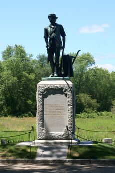 After the first fire of the regulars, I thought, and so stated to Ebenezer Munroe ... who stood next to me on the left, that they had fired nothing but powder; but on the second firing, Munroe stated they had fired something more than powder, for he had received a wound in his arm; and now, said he, to use his own words, "I'll give them the guts of my gun." We then both took aim at the main body of British troops the smoke preventing our seeing anything but the heads of some of their horses and discharged our pieces.[56]