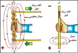 قاعدة اليد اليمنى. توضح هذه القاعدة اتجاه المجال المغنطيسي حول سلك يحمل تيارًا كهربائيًا. فعندما يشير إبهام اليد اليمنى في اتجاه سريان التيار في سلك مستقيم (أقصى اليمين) تلتف بقية الأصابع حول السلك في اتجاه المجال. أما إذا كان السلك الحامل للتيار ملتويًا في شكل ملف فإن المجال المغنطيسي يكون أقوى. ويسمى مثل هذا الملف الوشيعة. ويمكن تعيين اتجاه المجال المغنطيسي المحيط بالوشيعة (إلى اليمين) بلف الأصابع حول الملف في اتجاه التيار، حيث يشير الإبهام عندئذ إلى القطب الشمالي للوشيعة، ويوضح اتجاه المجال. وتستخدم قاعدة اليد اليمنى عند التفكير في التيار على أنه سريان شحنات كهربائية موجبة.