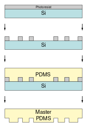 - ^ أ ب Greener, Jesse; Li, Wei; Ren, Judy; Voicu, Dan; Pakharenko, Viktoriya; Tang, Tian; Kumacheva, Eugenia (2010-02-02). "Rapid, cost-efficient fabrication of microfluidic reactors in thermoplastic polymers by combining photolithography and hot embossing". Lab Chip (in الإنجليزية). 10 (4): 522–524. doi:10.1039/b918834g. ISSN 1473-0189. PMID 20126695. S2CID 24567881.