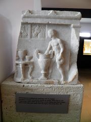 Left, the god Dionysos riding a cheetah, mosaic floor in the "House of Dionysos" at Pella, Greece, c. 330–300 BC. Right, a framentary votive relief depicting a youth ladling wine from a krater next to a round table with vases, from the agora of Pella, end of 4th century BC, Archaeological Museum of Pella.