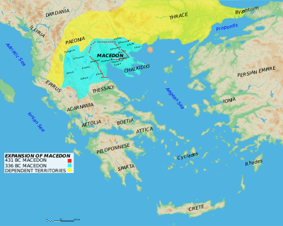 مملكة مقدونيا في in 336 ق.م. (برتقالي) | |||||||||||||||