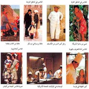 تعدد أغراض الملابس يؤدي تنوع أغراض الملابس إلى تنوع أشكالها وتصميماتها في كل أنحاء العالم. وتعزى أغراض لبس الملابس إلى حماية النفس أو التعرف على هوية الآخرين، أو إظهار الزينة. وتوضح الصور في الصف العلوي نماذج من الناس ترتدي الملابس بغرض الحماية، وهم من أقاليم مناخية مختلفة. وتوضح الصور في الصف السفلي نماذج من دول مختلفة، حيث يرتدي الناس الملابس بغرض إبراز الهوية والزينة.