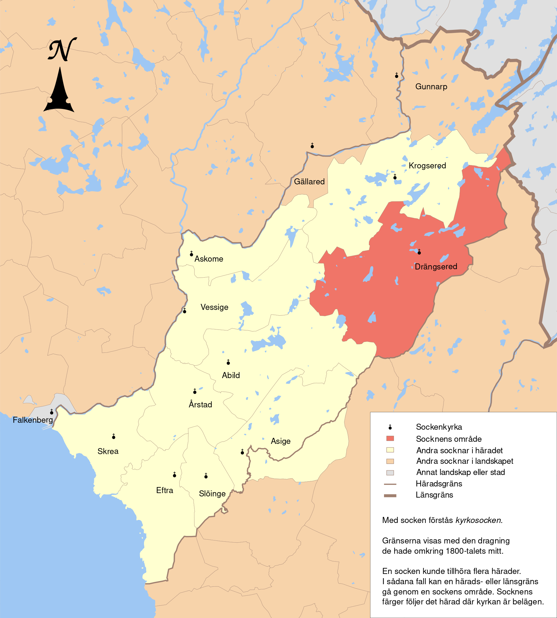 English: Map showing the borders of the civil parish of Drängsered in the hundred of Årstad, Halland County, Halland Region of Sweden. Circa 1850-1900. |