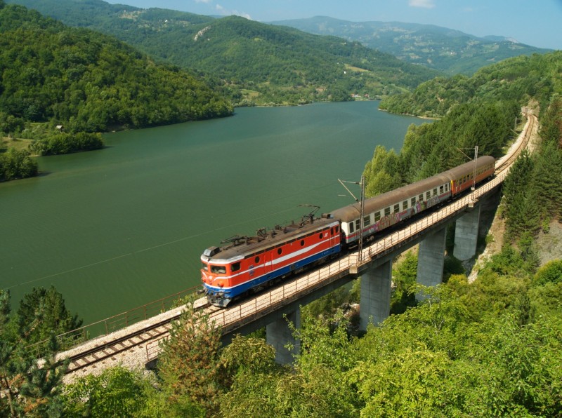 English: A ZS (Železnice Srbije, Serbian Railways) class 441 locomotive with the morning stopping train from Belgrade to Prijepolje Teretna near Priboj, over a reservoir.