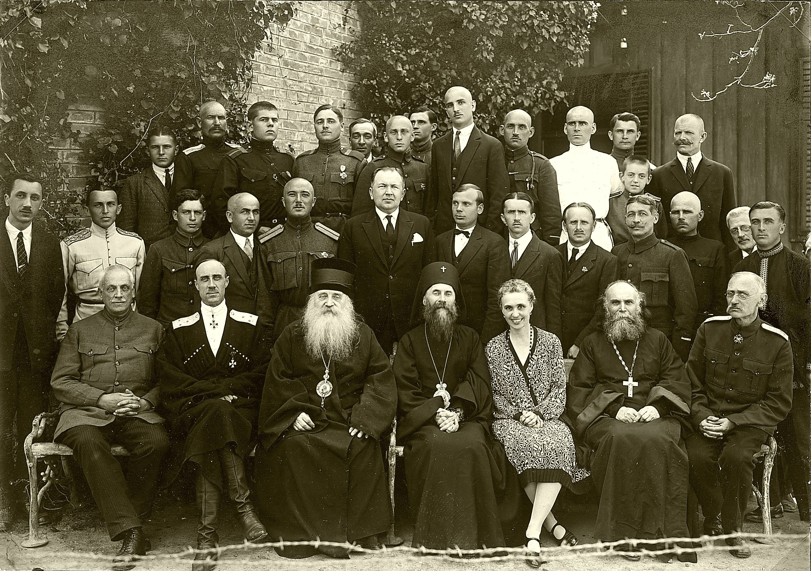 {{country data П.Н.ВРАНГЕЛЬ, митрополит Антоний (Храповицкий) и другие гости и постояльцы в «Здравнице имени генерала Врангеля» в Белграде на Дединье. Надпись на фотографии: "В первый день святой Пасхи в здравнице в Топчидере 11/24 апреля 1927 года" 15,5 х 24 см. на картоне. владельческая запись на оборотной стороне, указывающая персонажей. подклейка прозрачным скотчем. очень редкое фото. Санаторий (здравницу) для больных русских военных в Белграде устроила жена полководца баронесса О.М.Врангель (1883-1968). В первом ряду сидят (слева направо):