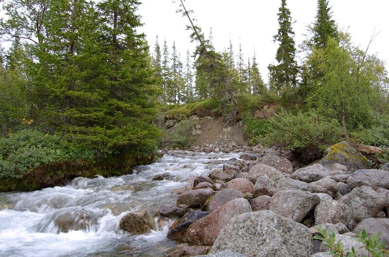 قالب:Country data Хибины, река Малая Белая English: Malaya Belaya river, Khibliy, Kola Peninsula. Trees are Picea × fennica. |