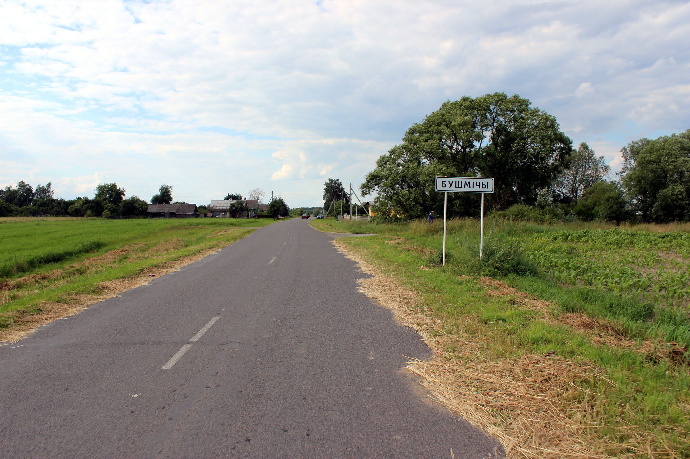 قالب:Be English: Entrance to Bušmičy village in Kamieniec District, Brest Region, Belarus. The village limit sign in the Belarusian language can be seen. |