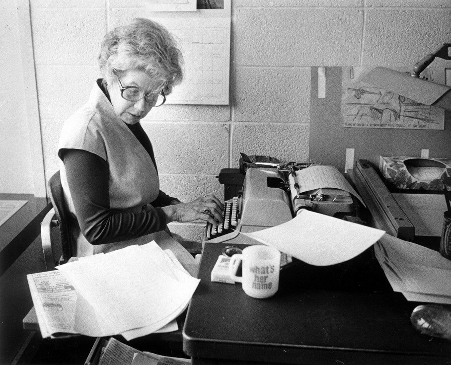 English: מרי מקגרורי בזמן עבודתה בדסק החדשות של ה-Washington star. בשנת 1975 |