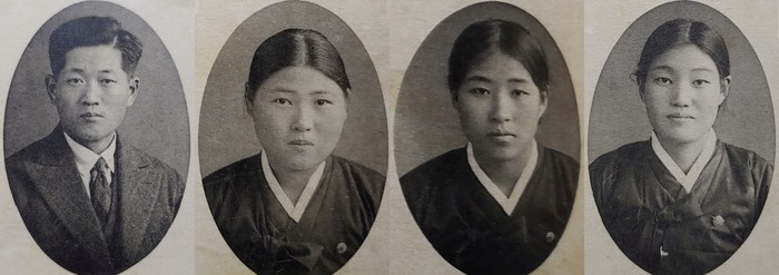 (Korean) English: Dongduk Girls' High School 1932 graduation album. From left are Gwansul Lee, Sungeum Lee, Jonghee Lee, and Hyojeong Lee |