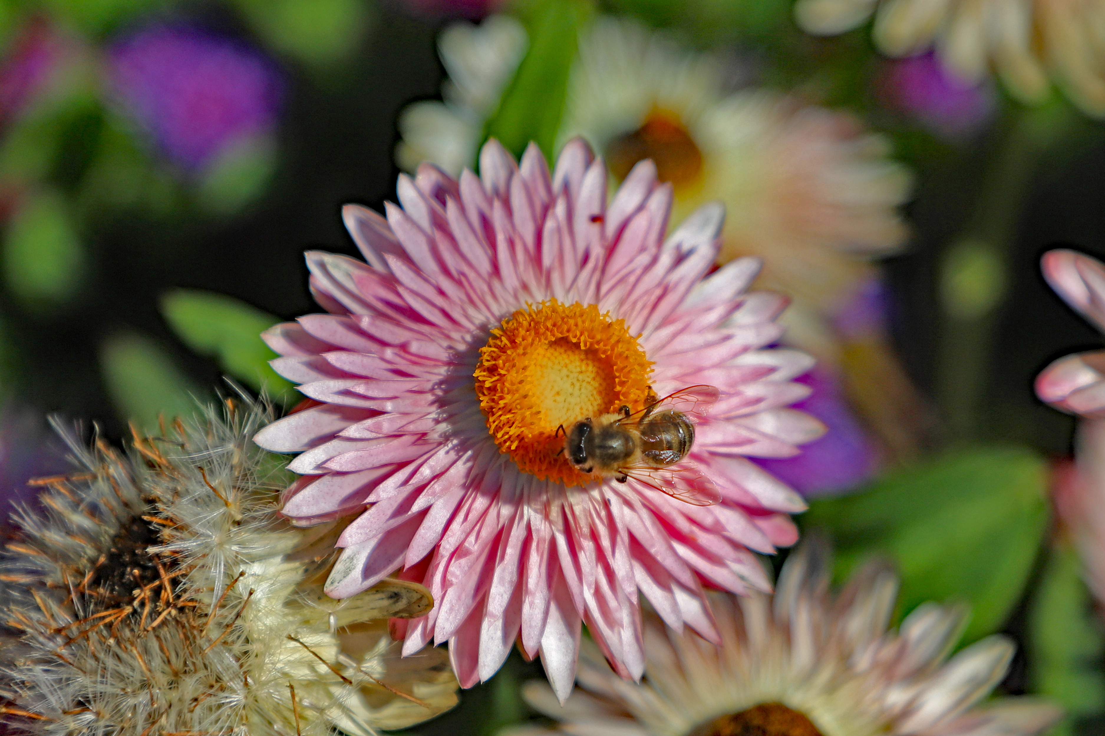 Deutsch: Gartenstrohblume mit Insekte (Fliege). Die Strohblume ist eine Gattung der Korbblütter.