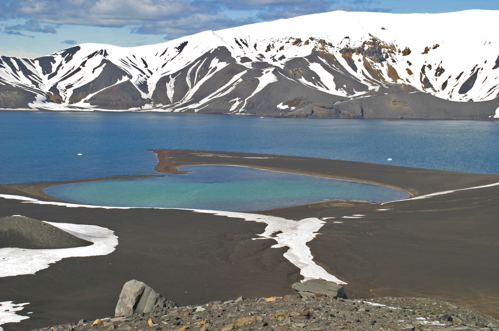 Deutsch: Antarktis - Deception Island: Die Insel ist ein eingebrochener Vulkan und besteht heute aus dem ringförmigen Rest einer Caldera mit einem Durchmesser von etwa 14 Kilometern. Das Bild zeigt den beim letzten Ausbruch im Jahre 1970 entstandenen Nebenkrater. |