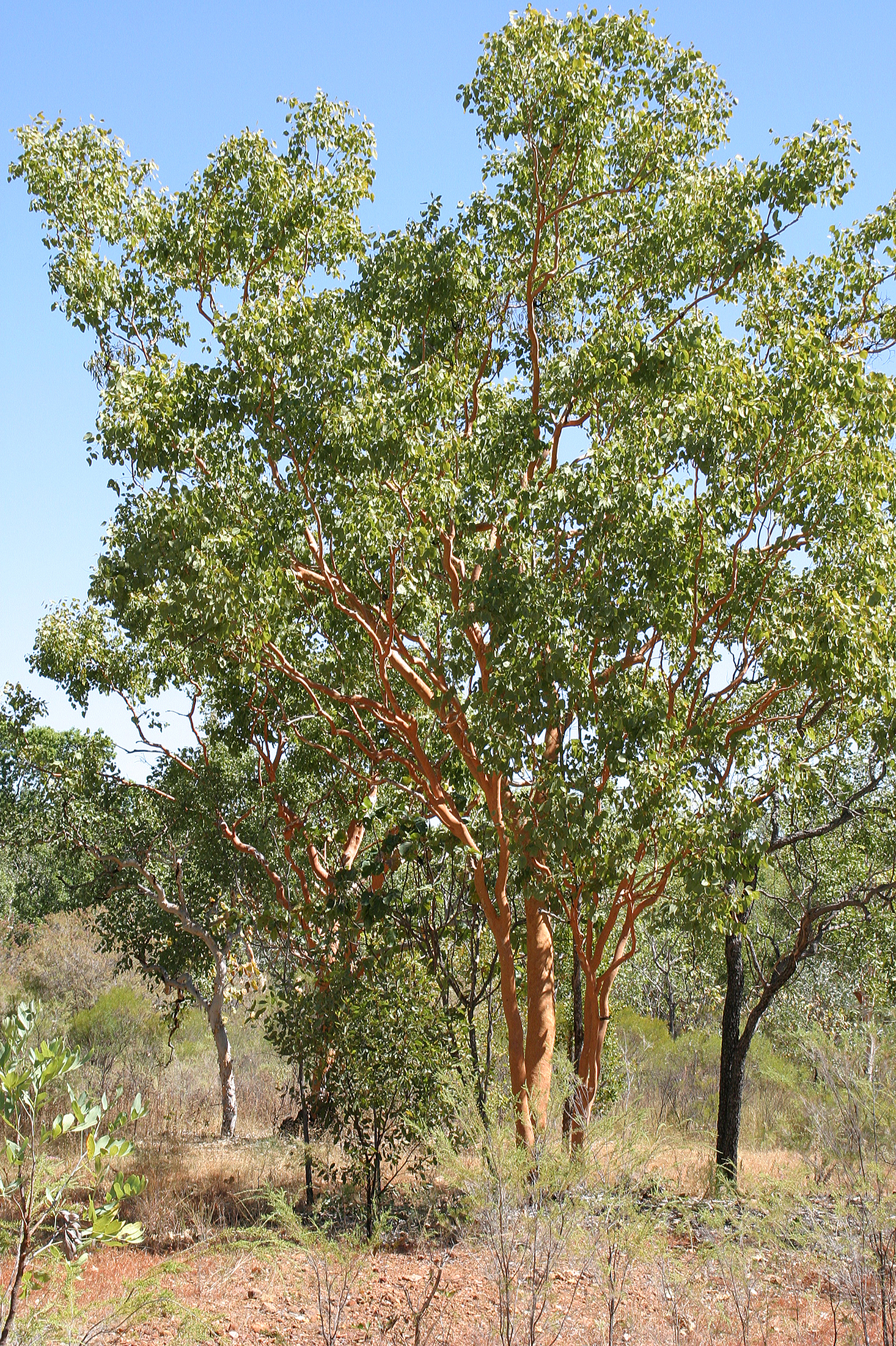English: Australia: Eucalyptus salubris is an evergreen, mostly multi-stemmed, shrub-like tree with a spreading crown: it can reach a height of 8 to 25 metres. The bark is smooth and copper or reddish brown. The tree species is native to Australia and is usually called "Gimlet Gum" or Fluted Gum Tree". Seen in Nitmiluk National Park. |
