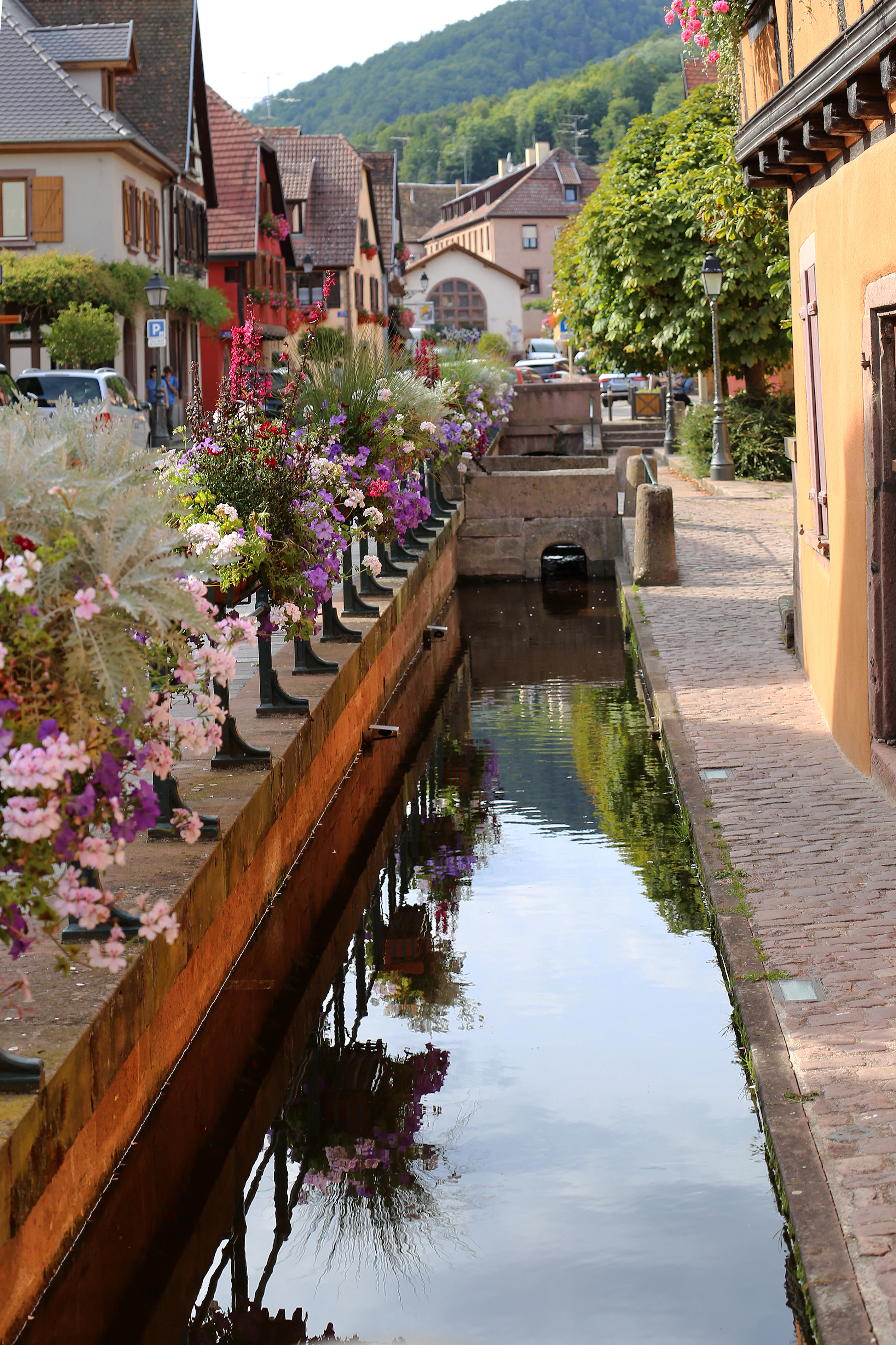 Deutsch: Wasserkanal entlang der Straße (Stadtbach, diente früher zur Wasserversorgung). Gesehen in Ribeauvillé, eine französische Stadt im Département Haut-Rhin (Elsass).