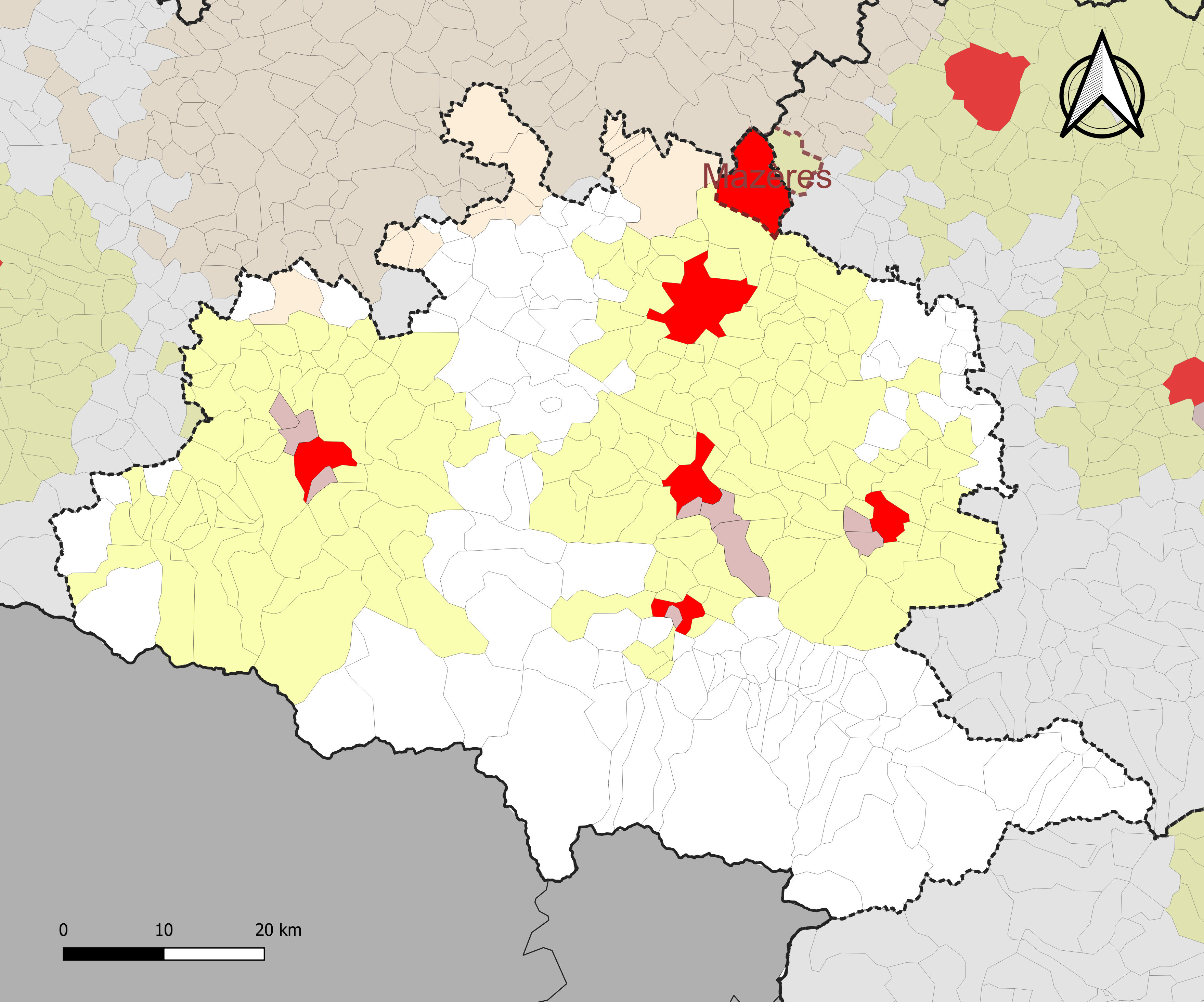 Own work avec les données : * Découpage administratif communal et départemental : Export simple de janvier 2020 - vérifié et simplifié à 5 m sur le site du portail de données libres du gouvernement français, élaboré avec le concours des contributeurs à OpenStreetMap * Périmètres des aires d'attraction des villes : Base des aires d'attraction des villes 2020 définie par l’Insee. Assemblé et enrichi dans fr:QGis. |