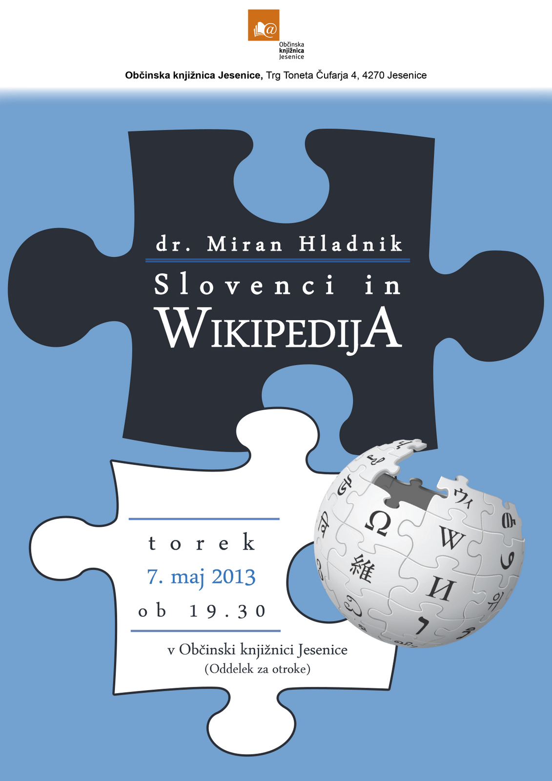 | Description | Plakat za predavanje o slovenski Wikipediji, Jesenice |