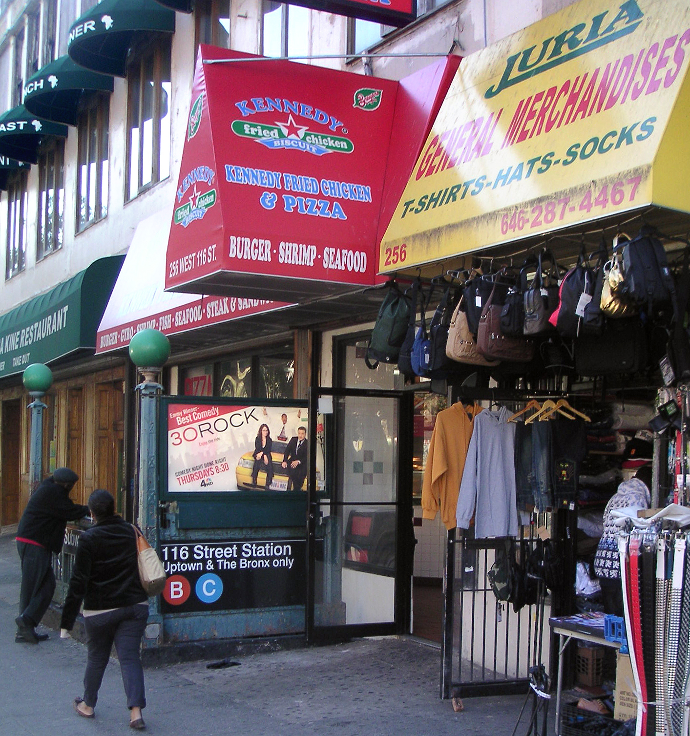 English: Southeast corner of 116th St. and Eighth Ave. (Frederick Douglass Boulevard) showing 116th St. entrance to the IND Eighth Avenue Line B and C trains. Harlem, New York.