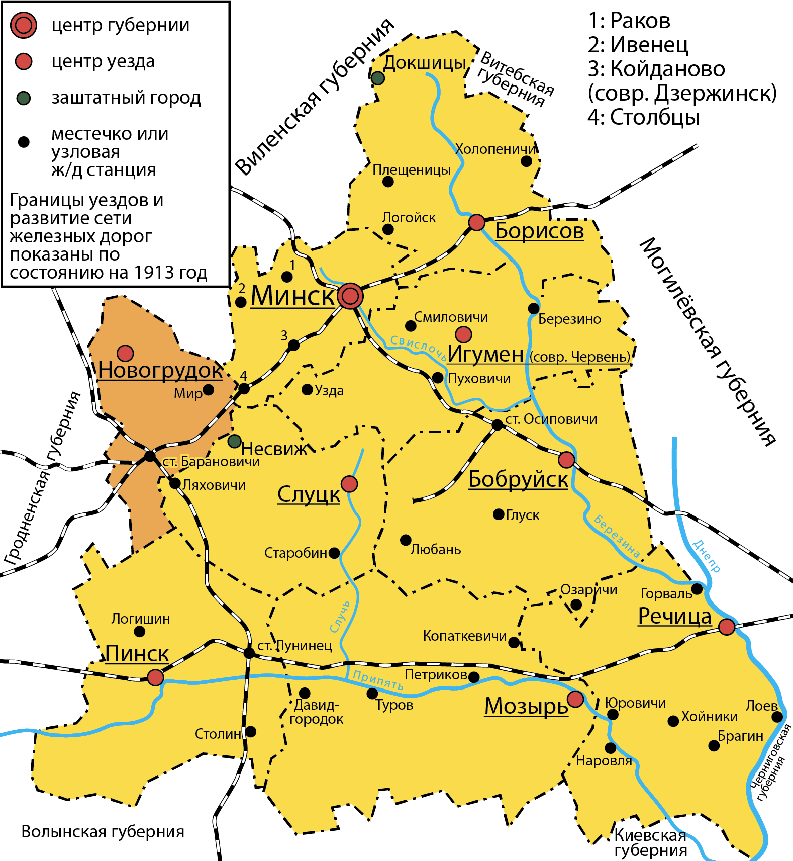 English: Navahrudski (Novogrudsky) uyezd (county) of the Minsk governorate of the Russian empire as of 1913.