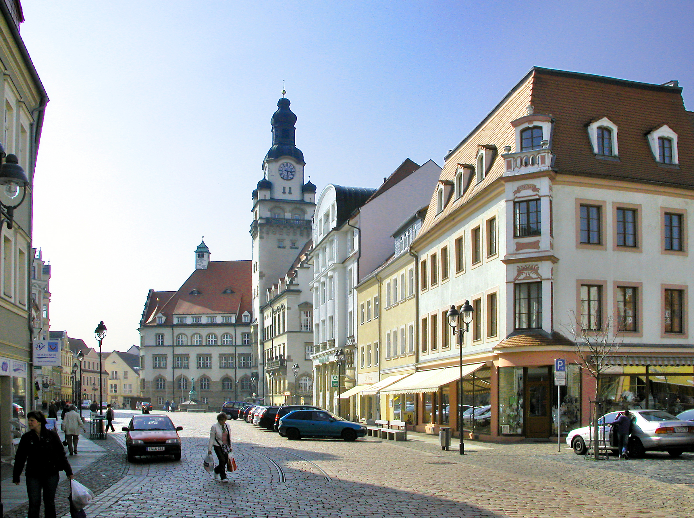 Deutsch: 02.04.2009 04720 Döbeln: Obermarkt, Blick nach Westen zum 1912 erbauten Rathaus (GMP: 51.121919,13.121776). Vorn rechts das Eckhaus Obermarkt 24 (GMP: 51.122065,13.123201). [DSCN35935.TIF]20090402320DR.JPG(c)Blobelt |