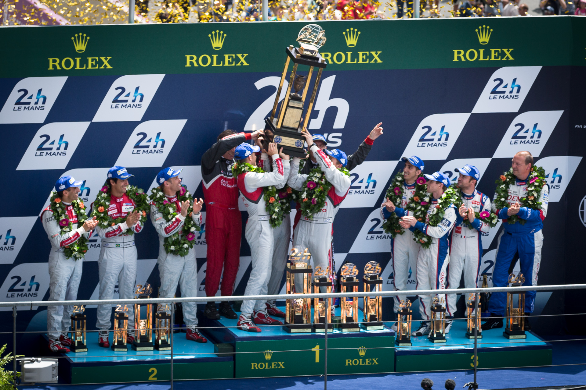 English: The podium for the 2014 24 Hours of Le Mans. 1st place, Benoît Tréluyer, Marcel Fässler, and André Lotterer for Audi, 2nd place Lucas di Grassi, Tom Kristensen, and Marc Gené of Audi, and 3rd place Anthony Davidson, Sébastien Buemi, and Nicolas Lapierre for Toyota. |