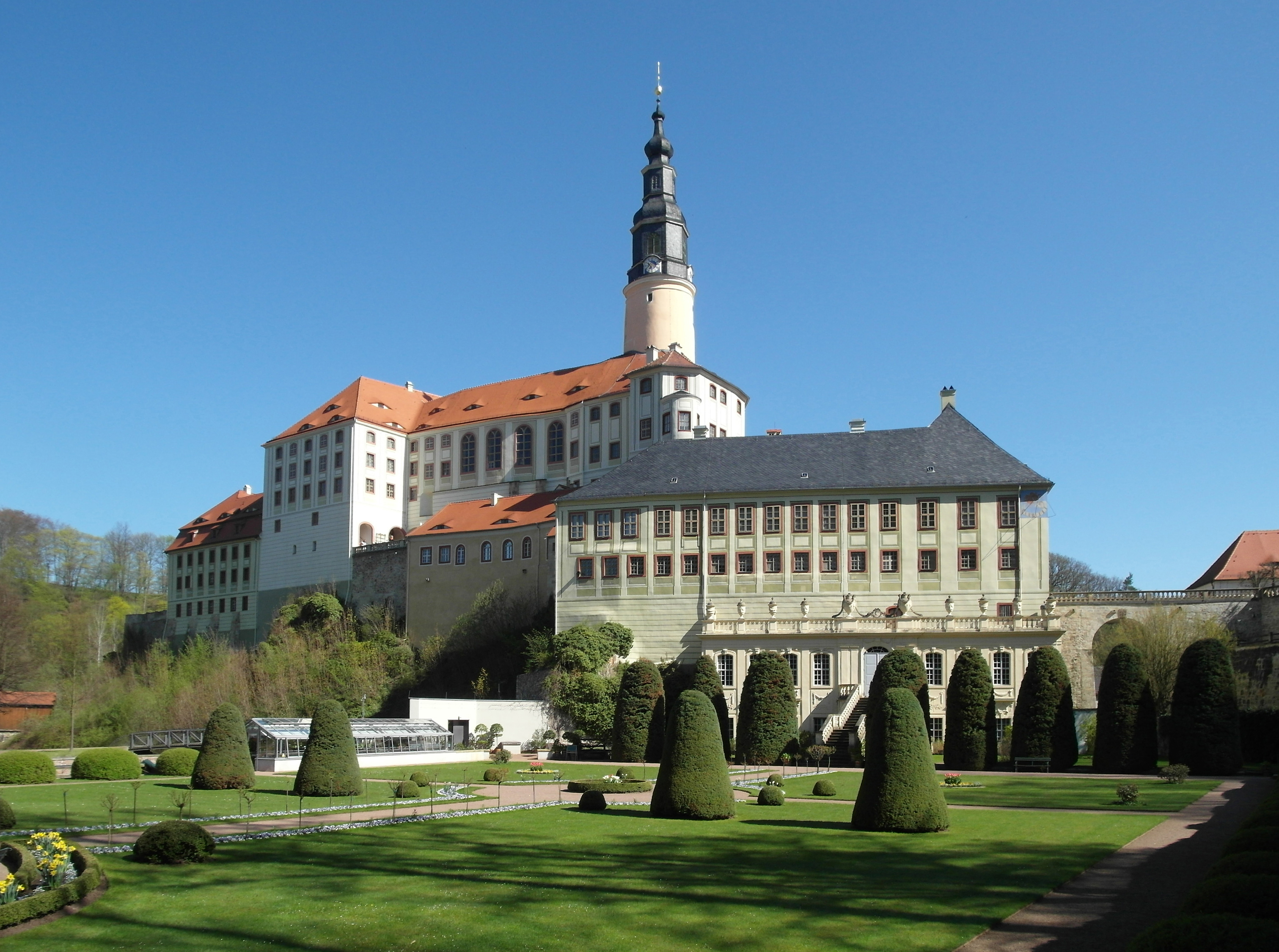Deutsch: 21.04.2016 01809 Weesenstein (Gem. Müglitztal): Blick aus dem Park zum Schloß, einem weiträumigen Gebäudekomplex (14.-19. Jh.) auf einem Felsen über der Müglitz. Als Lehen u.