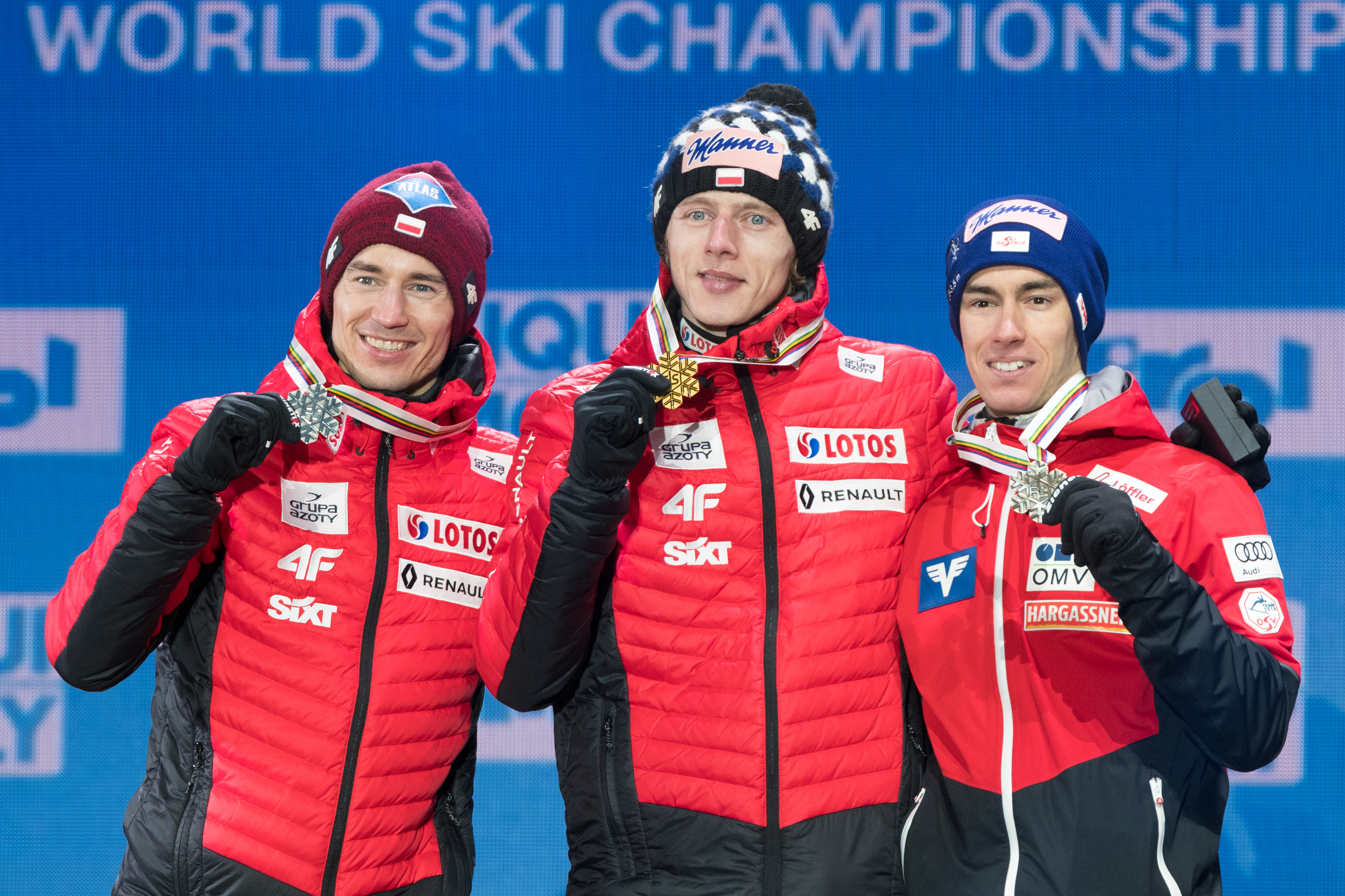 English: FIS Nordic World Ski Championships Seefeld 2019 - Medal Ceremony at the Medal Plaza. Picture shows Kamil Stoch (POL), Dawid Kubacki (POL), Stefan Kraft (AUT).