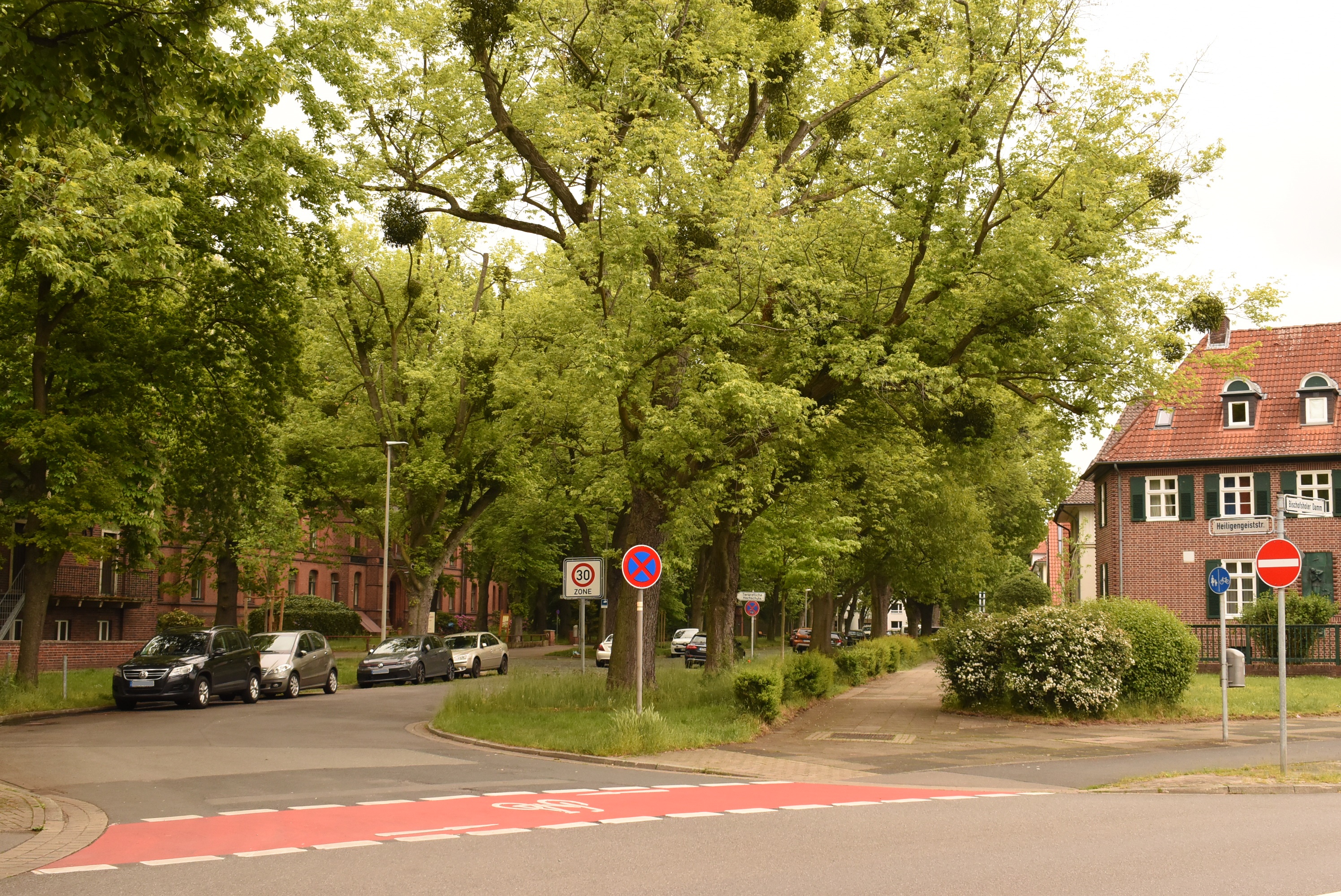 Deutsch: Blick von der Einmündung in den Bischofsholer Damm nach Osten in die Heiligengeiststraße in Hannover im Stadtteil Bult, linkerhand hinter der Abzweigung der Schwesternhausstraße das Stift zum Heiligen Geist. |