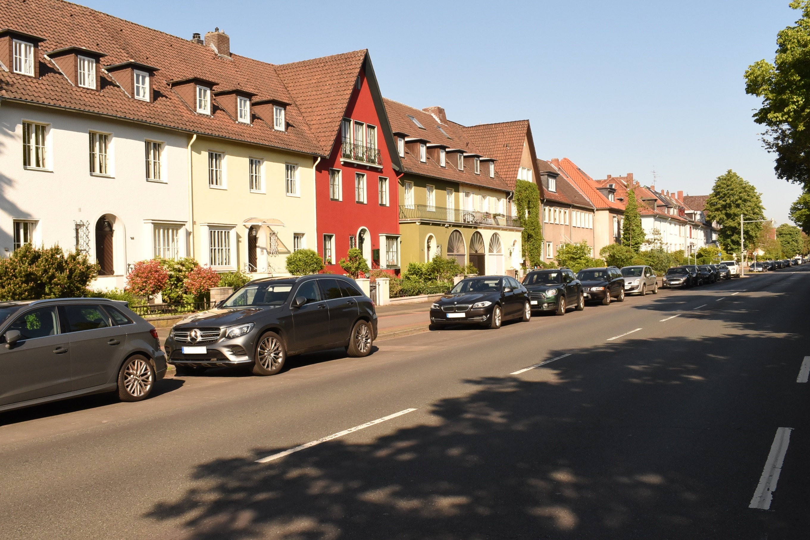Bischofsholer Damm in Hannover im Stadtteil Bult. Blick über die westlichen Fahrspuren des Bischofsholer Damms nach Nordwesten. Rechts im Bild der Grünstreifen, der hier die Fahrspuren der beiden Fahrtrichtungen trennt. |