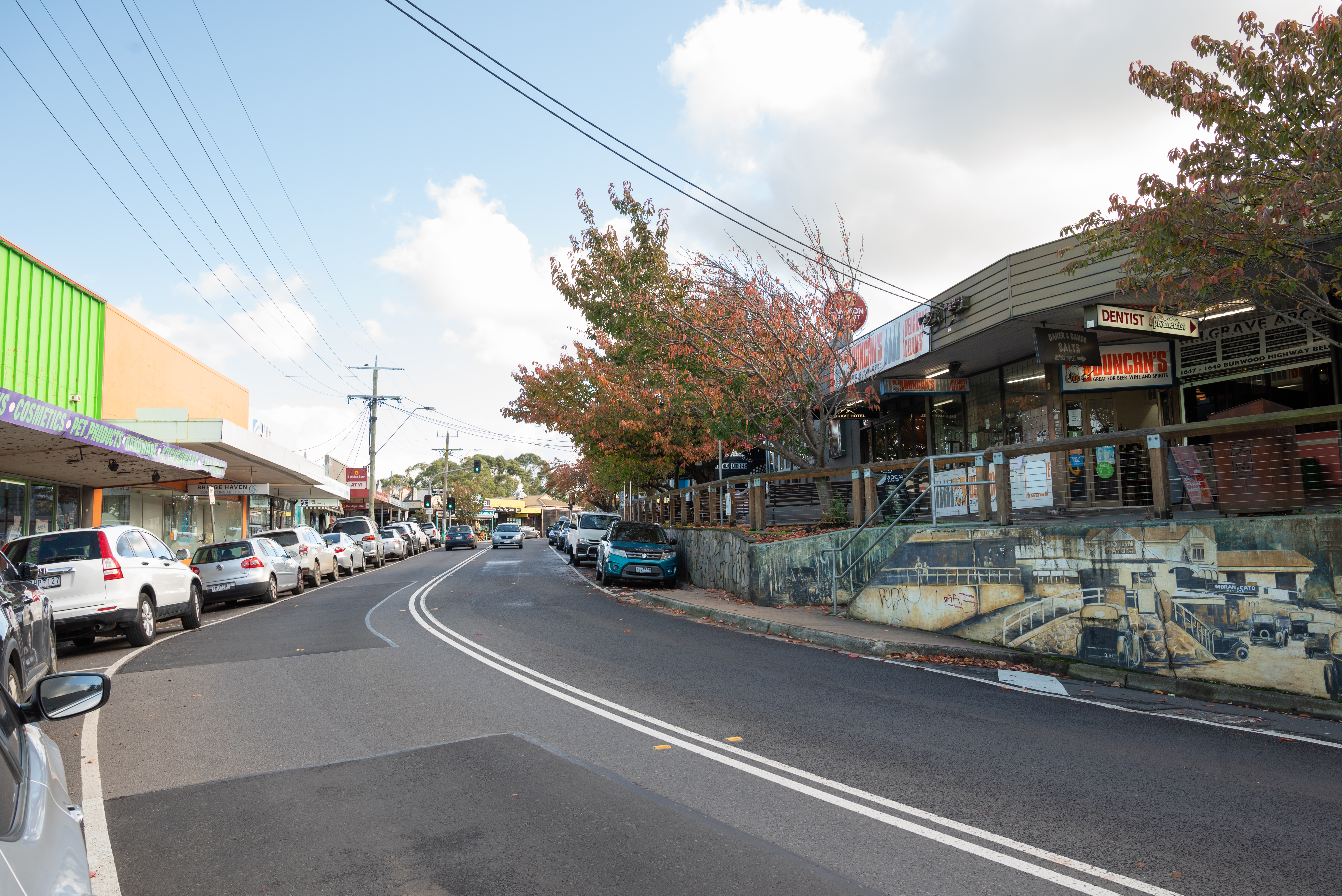 English: Belgrave main street shops located on Burwood Highway |