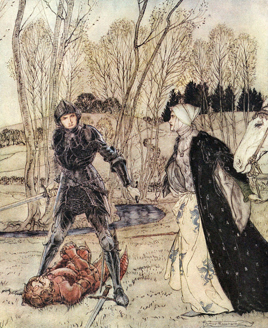 English: "How Beaumains defeated the Red Knight, and always the damosel spake many foul words unto him." From The Romance of King Arthur (1917). Abridged from Malory's Morte d'Arthur by Alfred W. Pollard. Illustrated by Arthur Rackham. This edition was published in 1920 by Macmillan in New York. |
