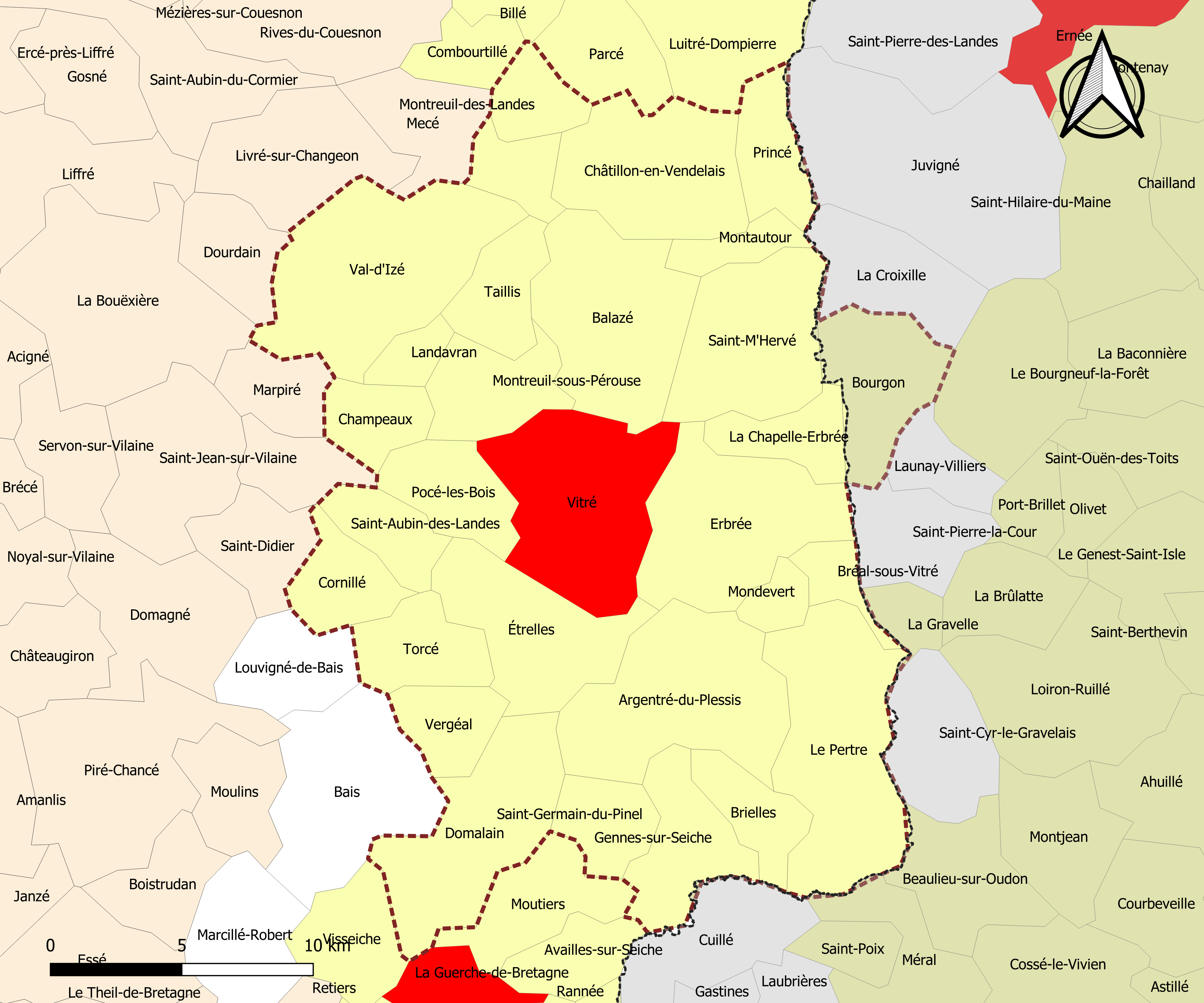 Français : Carte de l'aire d'attraction de Vitré dans le département d'Ille-et-Vilaine (France). Zonage 2020 - Découpage communal au 1er janvier 2020. |