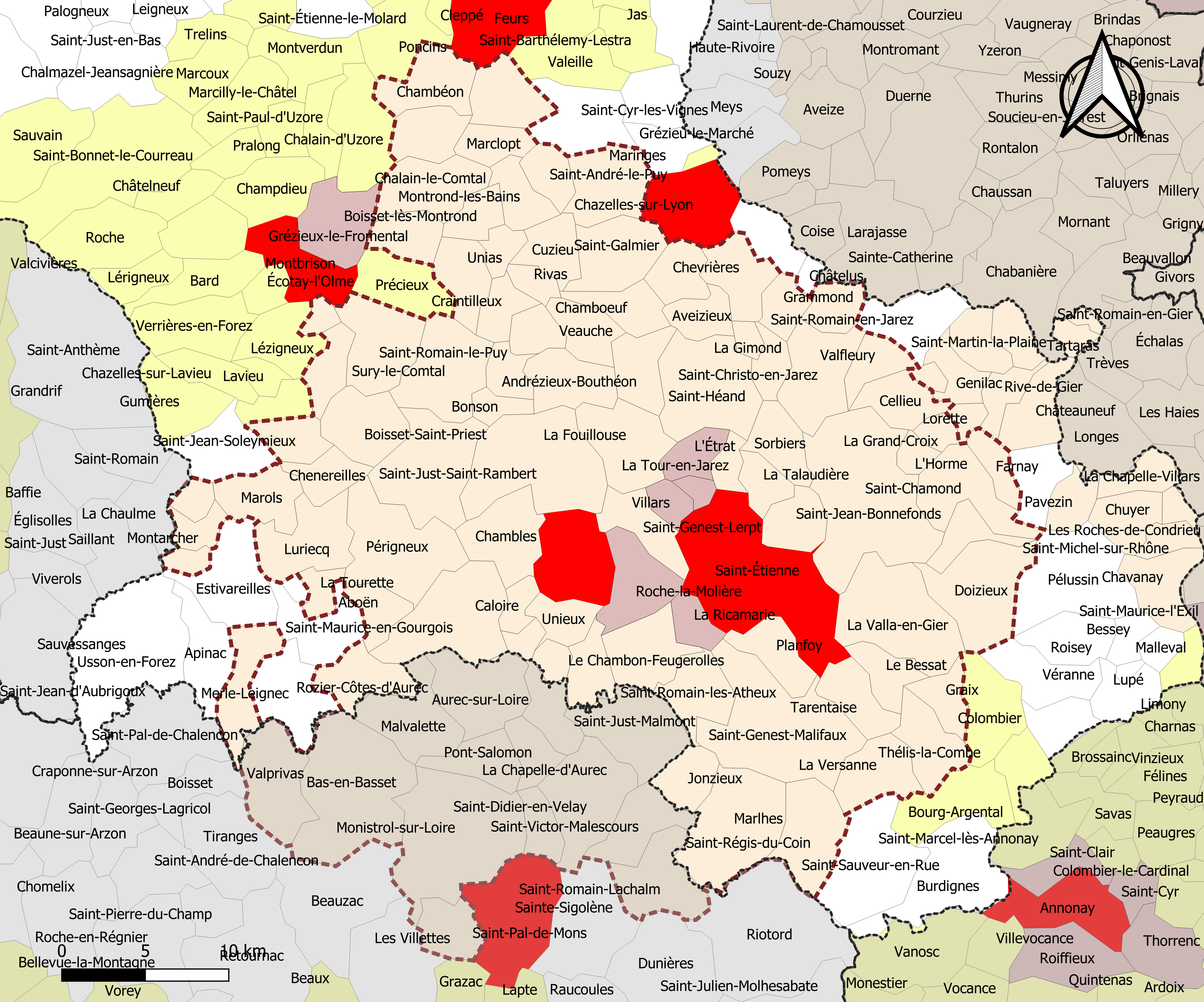 Français : Carte de l'aire d'attraction de Saint-Étienne dans le département de la Loire (France). Zonage 2020 - Découpage communal au 1er janvier 2020. |