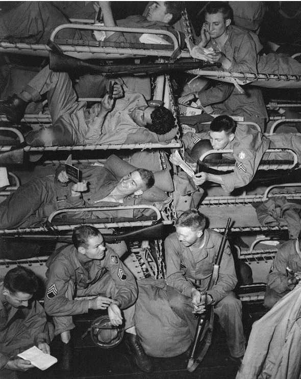 Troops headed for the invasion of Sicily studying guidebooks for North Africa and otherwise passing the time in their bunks on board a U. S. Navy transport. The ship may be USS James O'Hara (APA-90). Note that these men are armed with bolt-action Springfield rifles. They are from the 45th Infantry Division. Official U.S. Navy Photograph, now in the collections of the National Archives. |