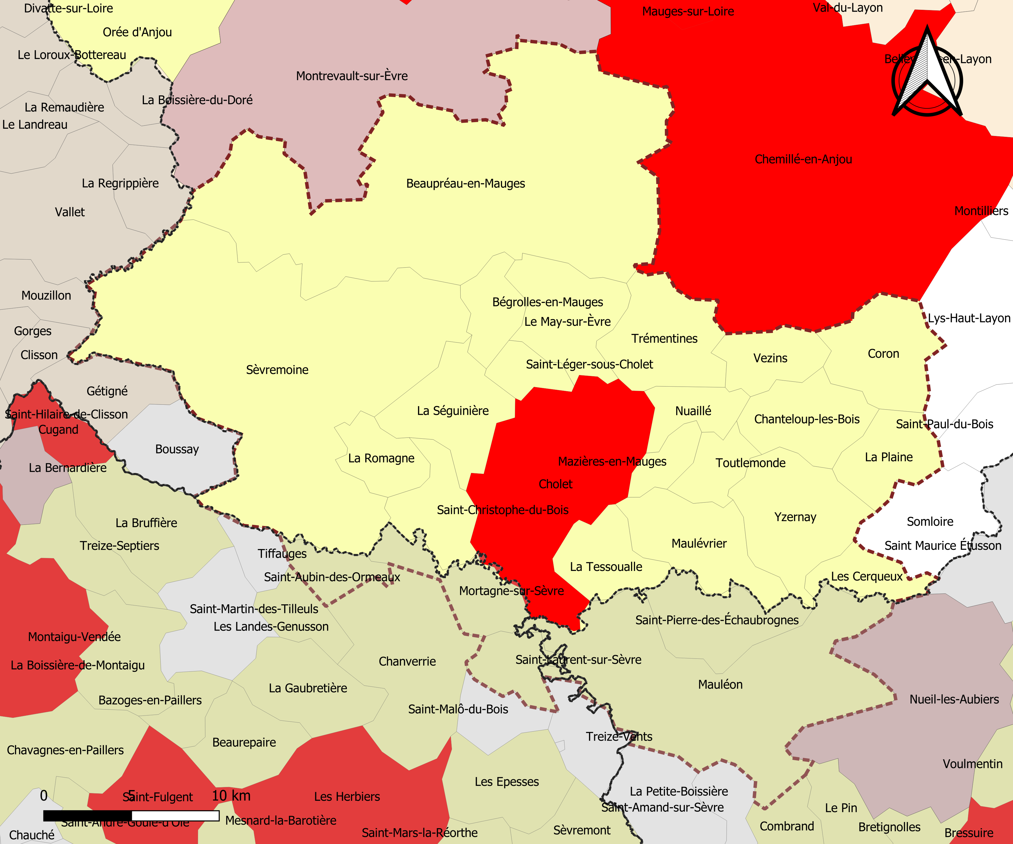 Français : Carte de l'aire d'attraction de Cholet dans le département du Maine-et-Loire (France). Zonage 2020 - Découpage communal au 1er janvier 2020. |