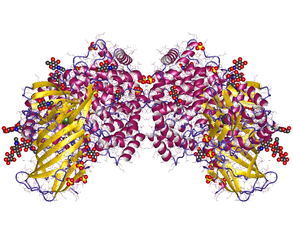 English: Aminopeptidase N homodimer + NAG (= N-acetyl glucosamine) + 2 Zn (dark green) + 22 SO4 (yellow), Human |