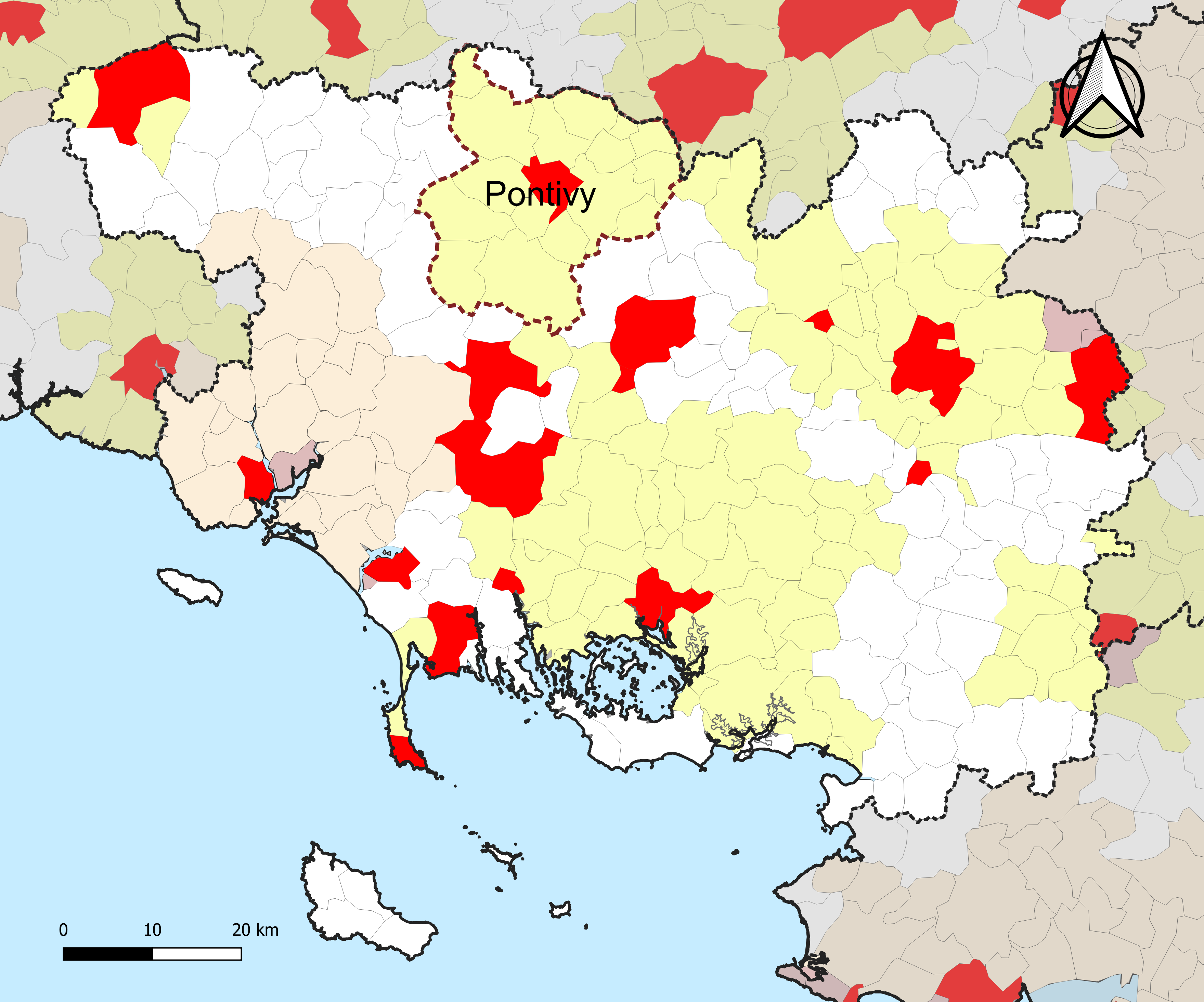 Français : Carte des aires d'attraction des villes 2020 dans le département du Morbihan (France). Mise en exergue de l'aire d'attraction de Pontivy. Découpage communal au 1er janvier 2020.
