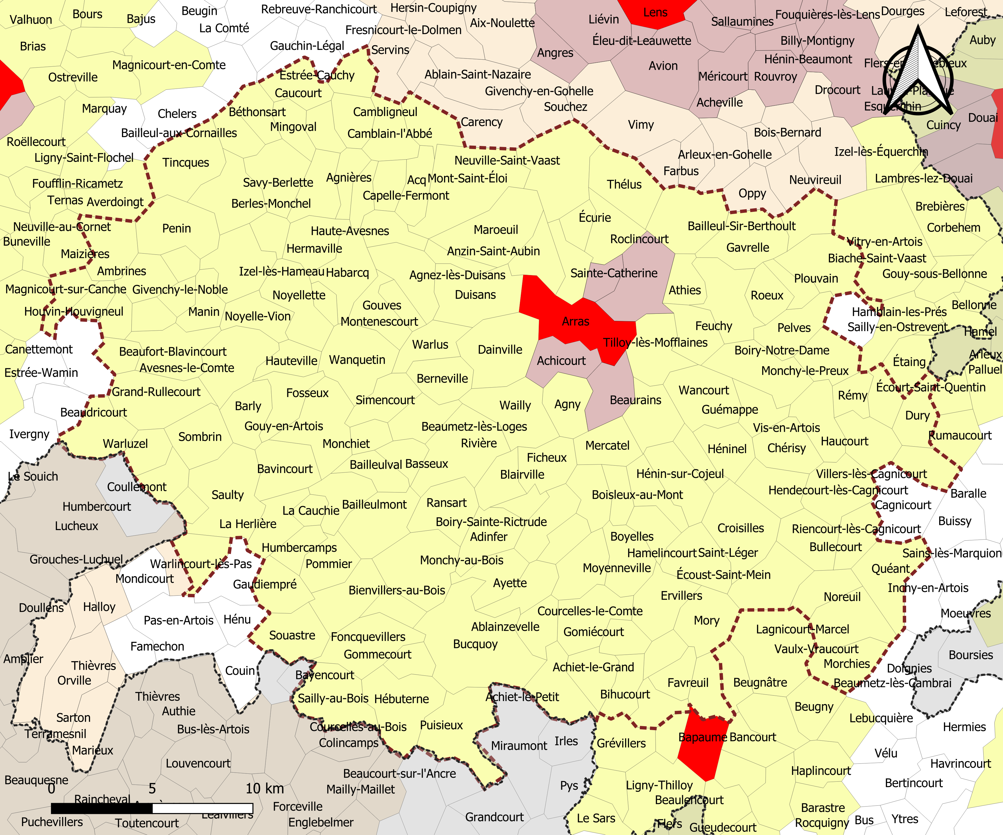 Français : Carte de l'aire d'attraction d'Arras dans le département du Pas-de-Calais (France). Zonage 2020 - Découpage communal au 1er janvier 2020. |